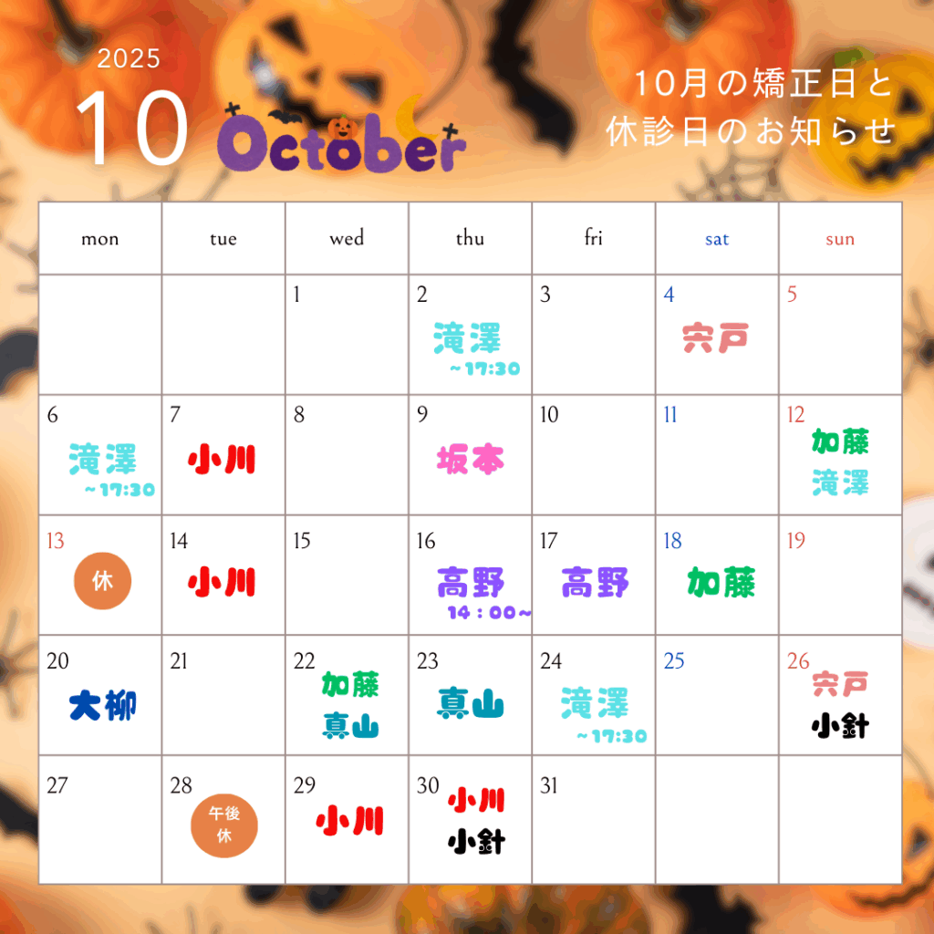カレンダーに名前の記載(その日出勤の矯正医)がある日程は相談を行っております。