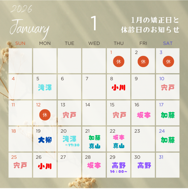 カレンダーに名前の記載(その日出勤の矯正医)がある日程は相談を行っております。